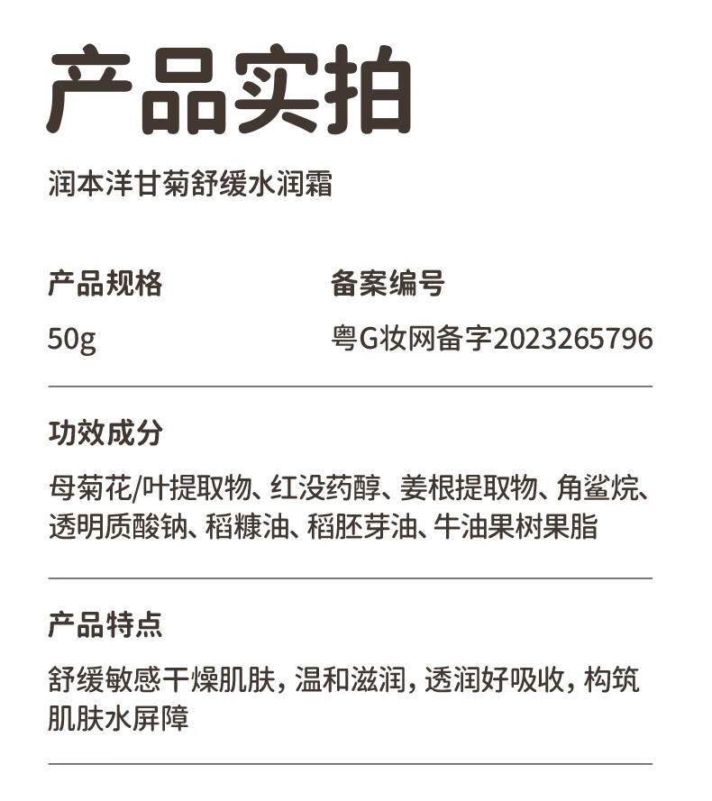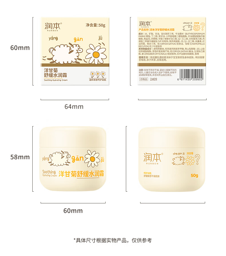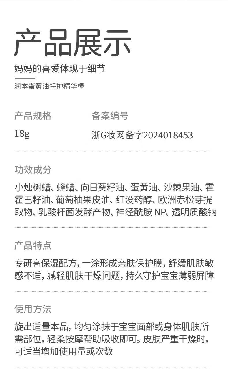 润本洋甘菊舒缓水润霜50g 儿童护理霜50g 婴童蛋黄油特护精华棒18g 专研高保湿配方,一涂形成亲肤保护膜, 舒缓肌肤敏感不适,减轻肌肤干燥问题, 持久守护宝宝薄弱屏障 舒缓敏感干燥肌肤,温和滋润, 透润好吸收,构筑肌肤水屏障