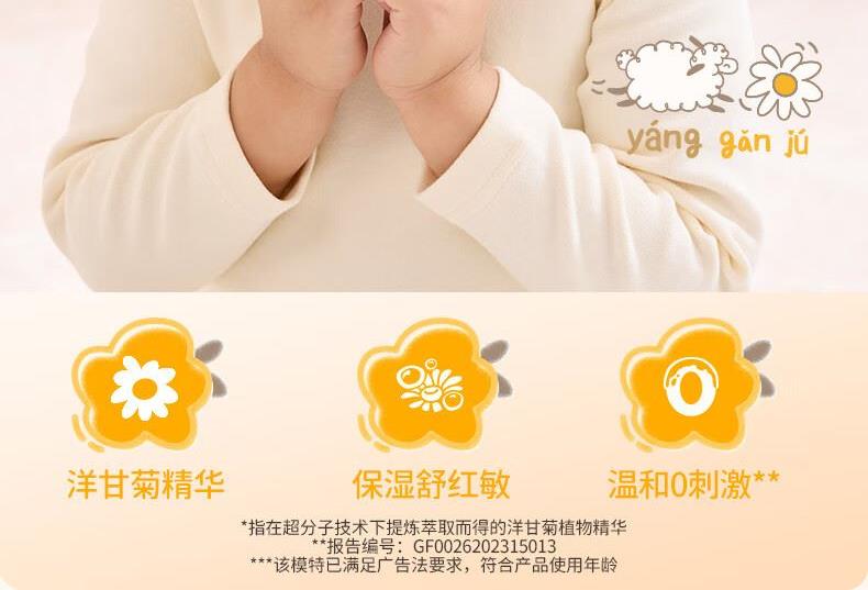 特点:构建肌肤双重屏障, 滋润保护孩子娇嫩肌肤, 更好适应季节环境变化带来的影响 主要成分:母菊花提取 特点:舒缓敏感干燥肌肤, 温和滋润,透润好吸收,构筑肌肤水屏障 产品特点:质地轻薄,以油净肤, 温和溶解肌肤表面油脂、污垢, 同时保护宝宝皮脂膜,滋润干燥肌