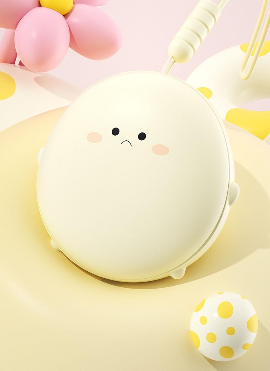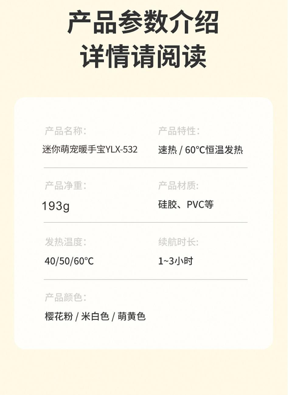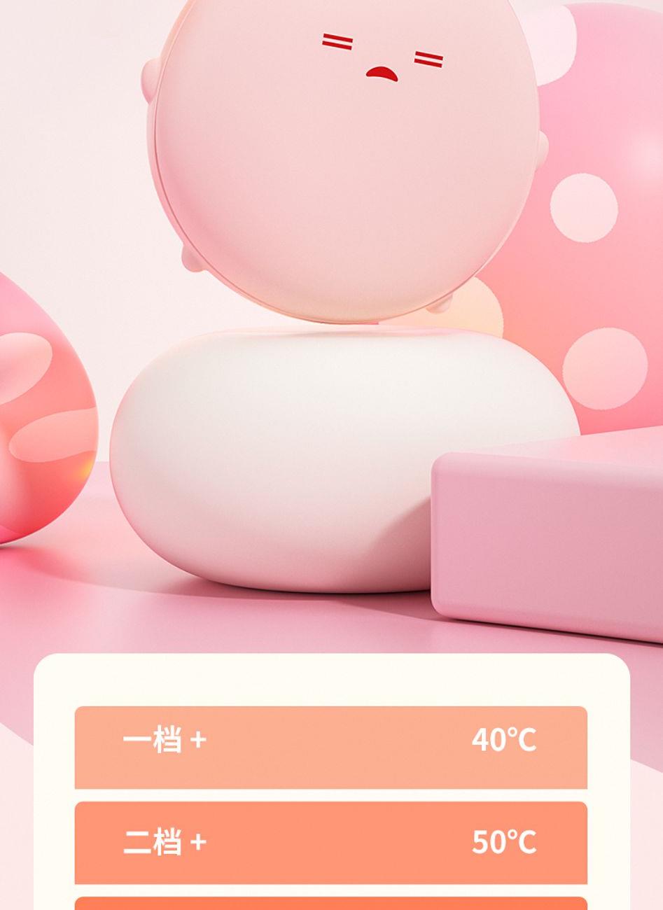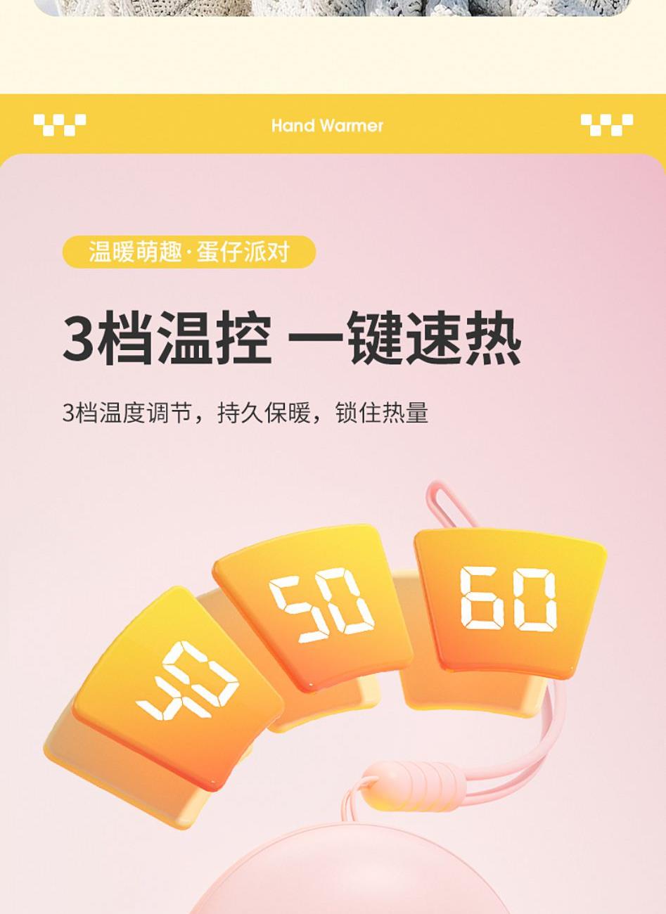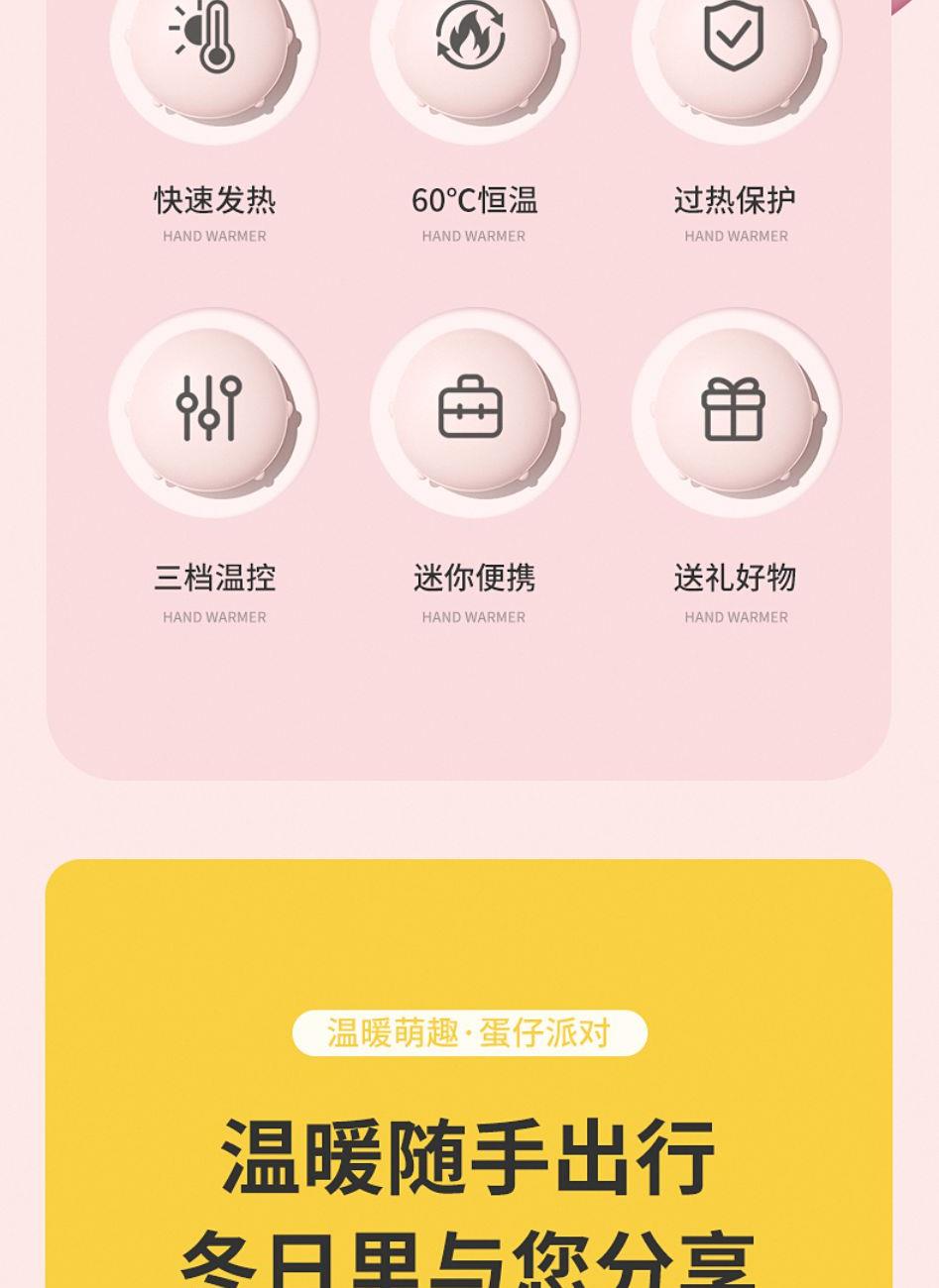 产品材质:ABS+电子元件+硅胶+PVC 产品尺寸: 8.8*8.6*3.75cm 产品颜色:奶白 粉色 黄色 净 重:193g 输入电流:5V/1A 电池容量:3600mAh 功 率:5w 使用时间:1.5-3小时 产品特点: 三档温控 一键速热 迷你小巧 携带方便 双面发热 360°全面温暖 可爱蛋仔造型 圆润舒适手感