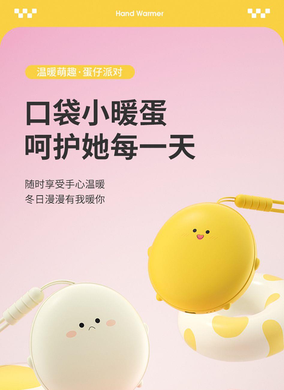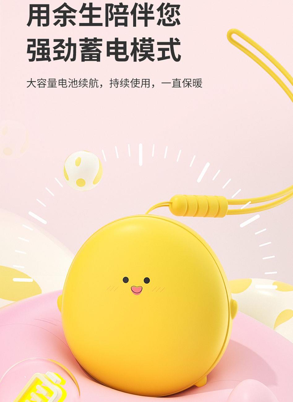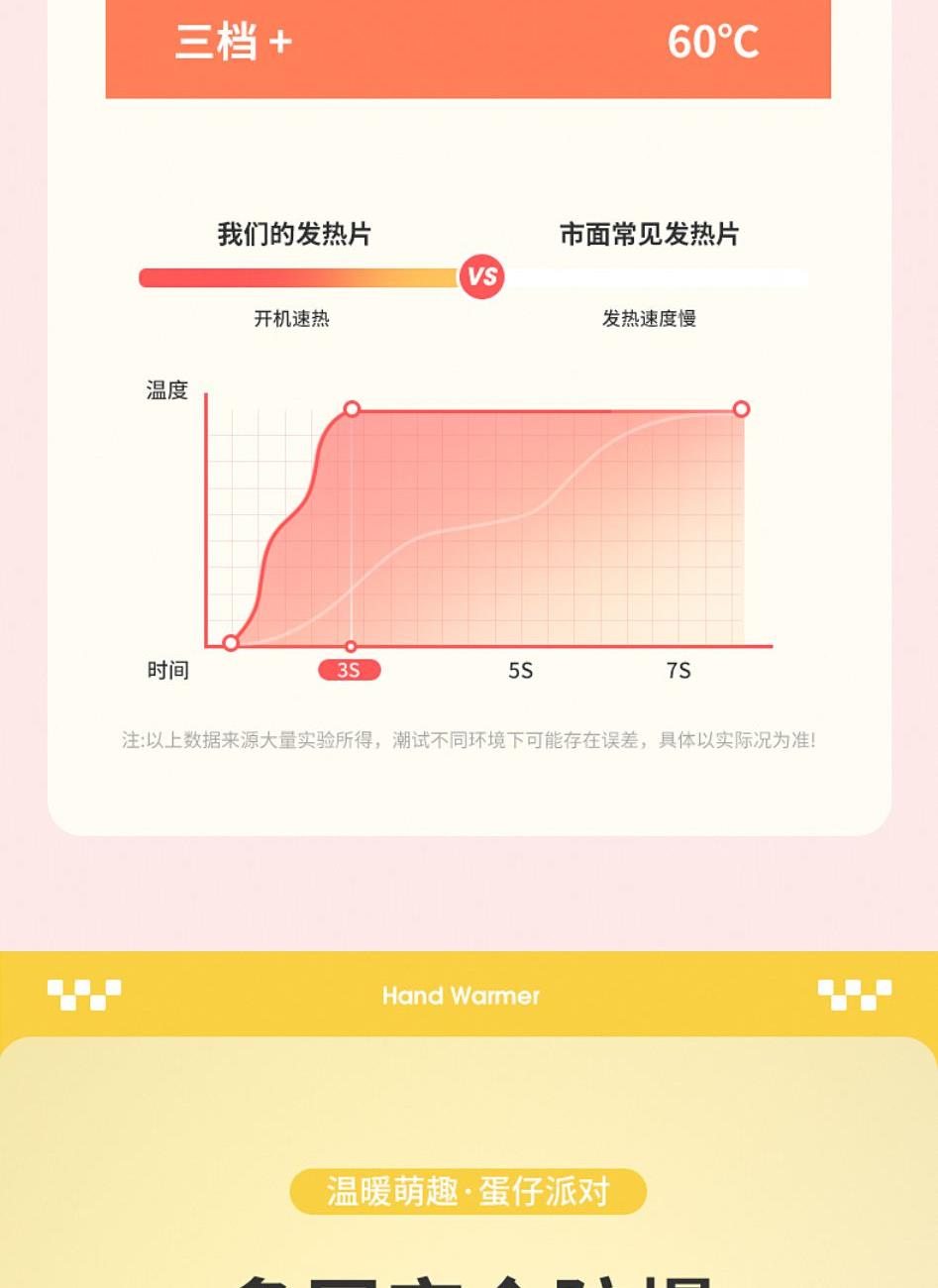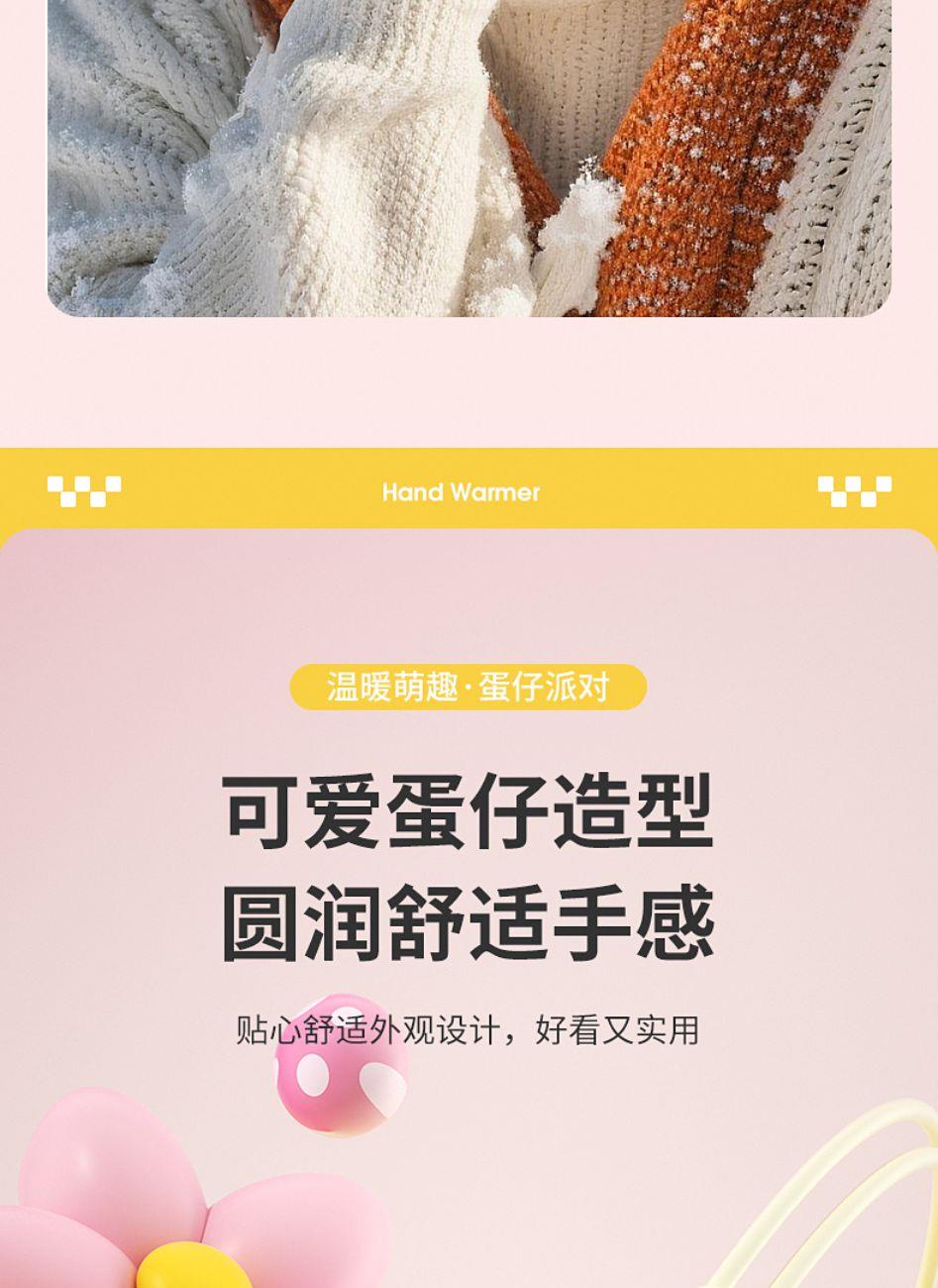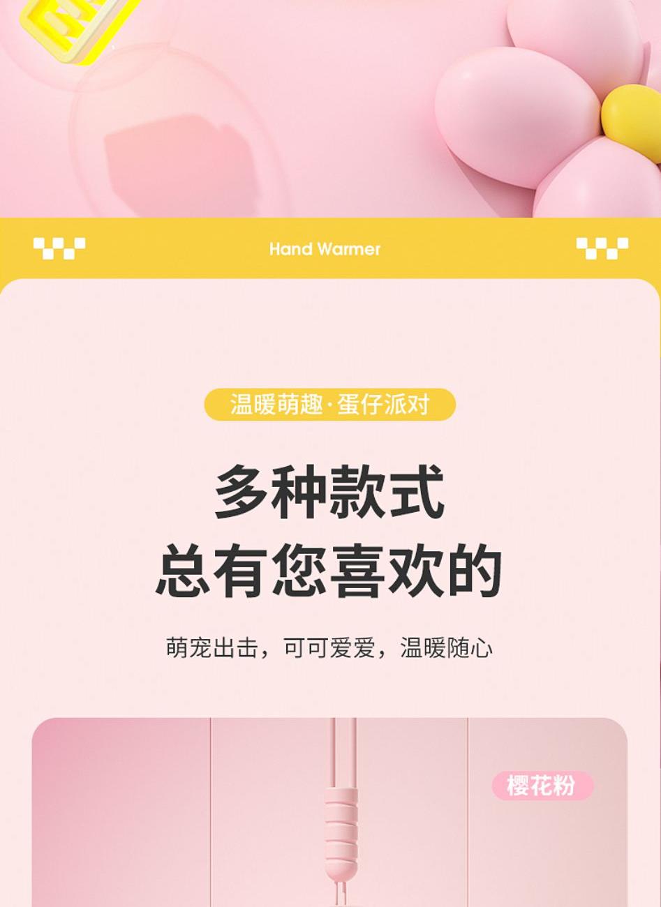 产品材质:ABS+电子元件+硅胶+PVC 产品尺寸: 8.8*8.6*3.75cm 产品颜色:奶白 粉色 黄色 净 重:193g 输入电流:5V/1A 电池容量:3600mAh 功 率:5w 使用时间:1.5-3小时 产品特点: 三档温控 一键速热 迷你小巧 携带方便 双面发热 360°全面温暖 可爱蛋仔造型 圆润舒适手感