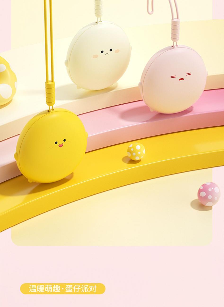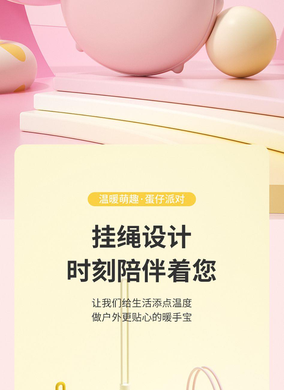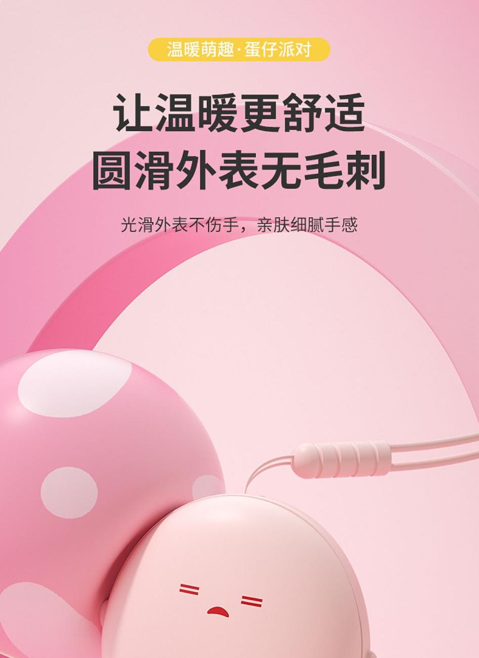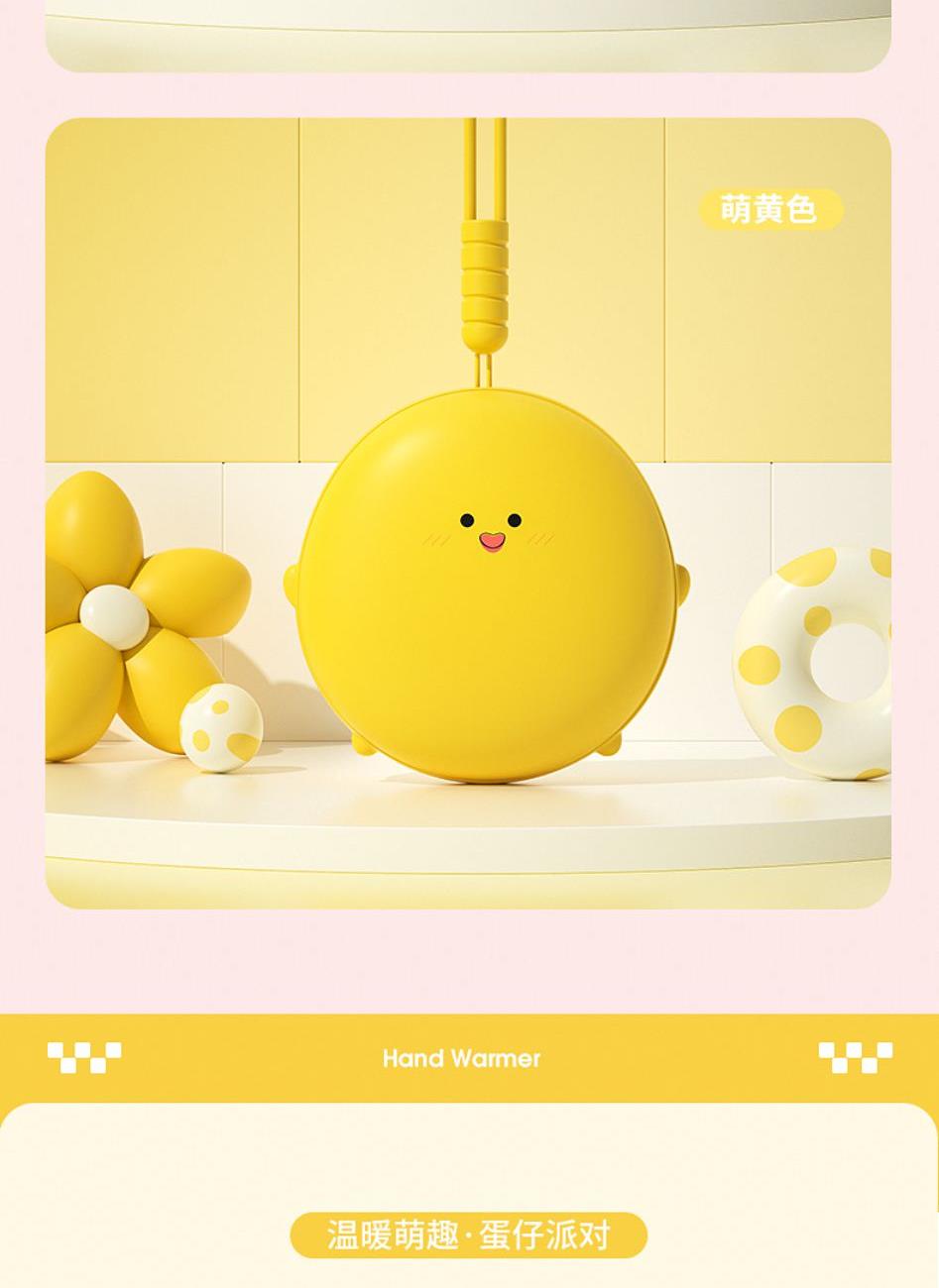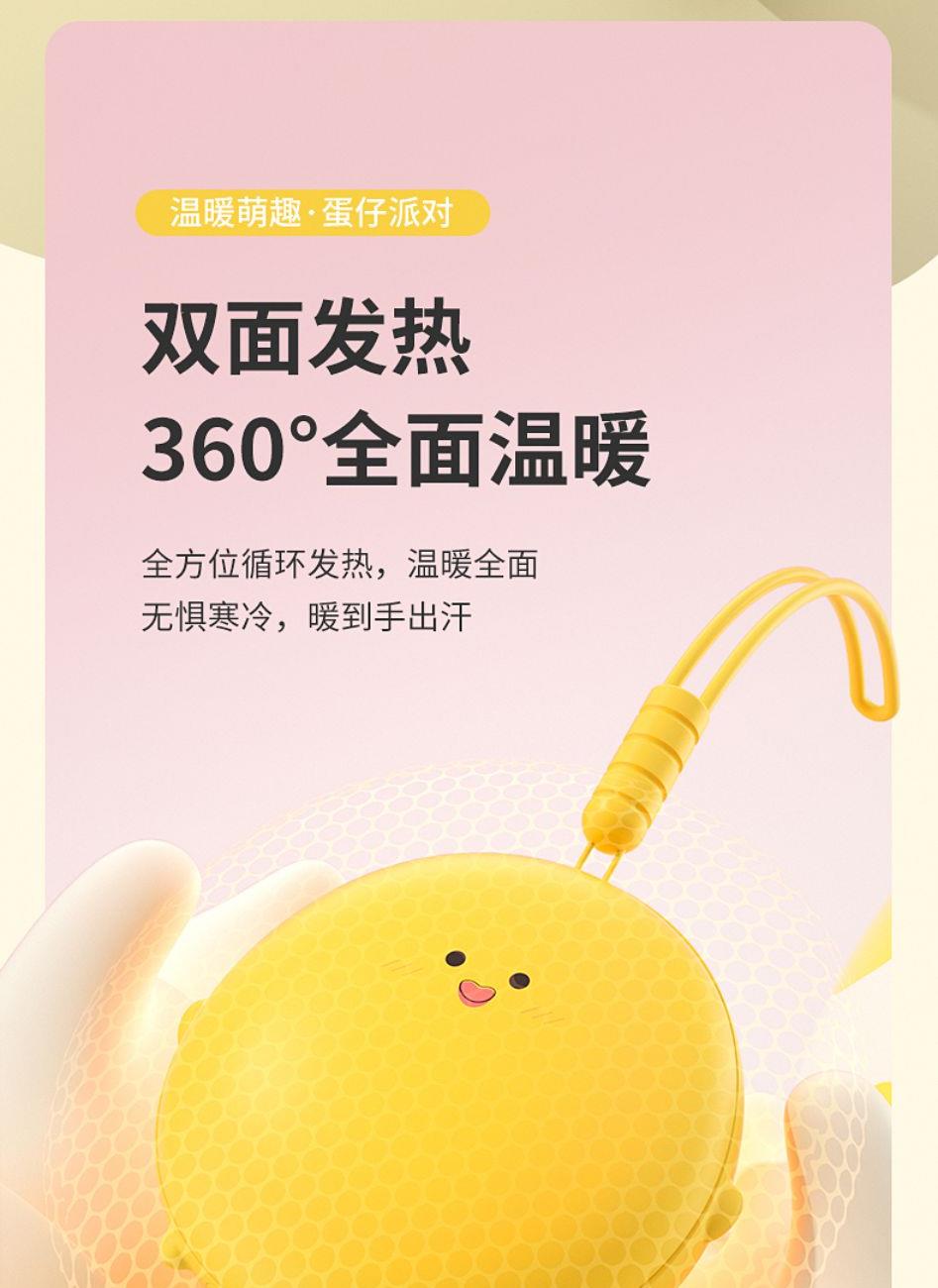 产品材质:ABS+电子元件+硅胶+PVC 产品尺寸: 8.8*8.6*3.75cm 产品颜色:奶白 粉色 黄色 净 重:193g 输入电流:5V/1A 电池容量:3600mAh 功 率:5w 使用时间:1.5-3小时 产品特点: 三档温控 一键速热 迷你小巧 携带方便 双面发热 360°全面温暖 可爱蛋仔造型 圆润舒适手感