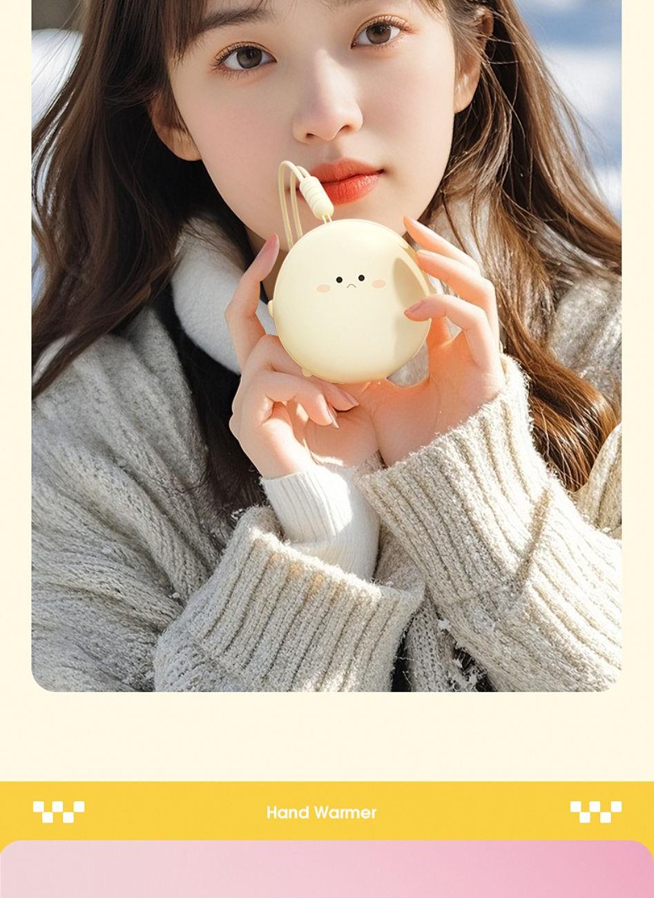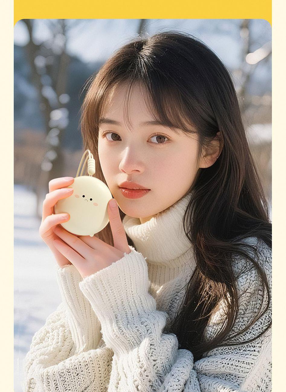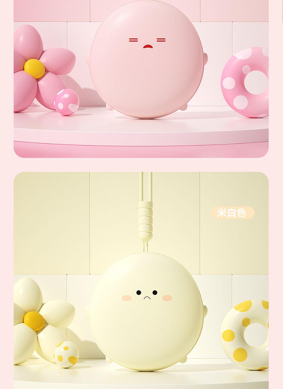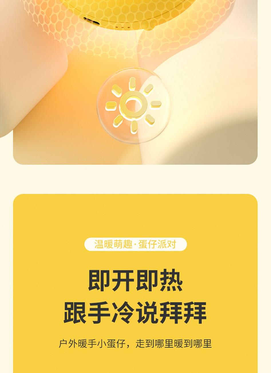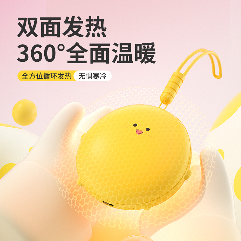 产品材质:ABS+电子元件+硅胶+PVC 产品尺寸: 8.8*8.6*3.75cm 产品颜色:奶白 粉色 黄色 净 重:193g 输入电流:5V/1A 电池容量:3600mAh 功 率:5w 使用时间:1.5-3小时 产品特点: 三档温控 一键速热 迷你小巧 携带方便 双面发热 360°全面温暖 可爱蛋仔造型 圆润舒适手感