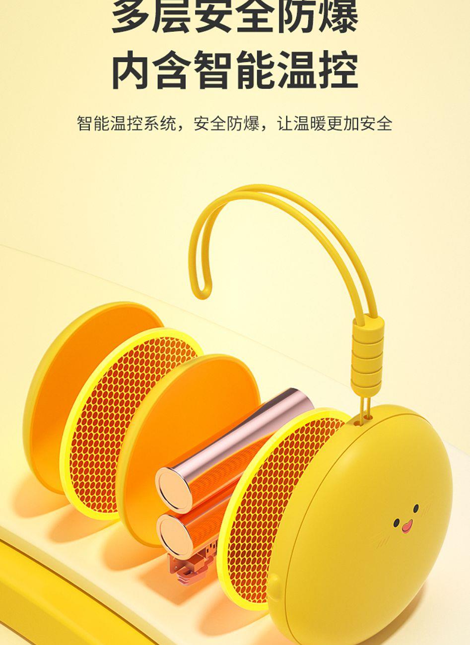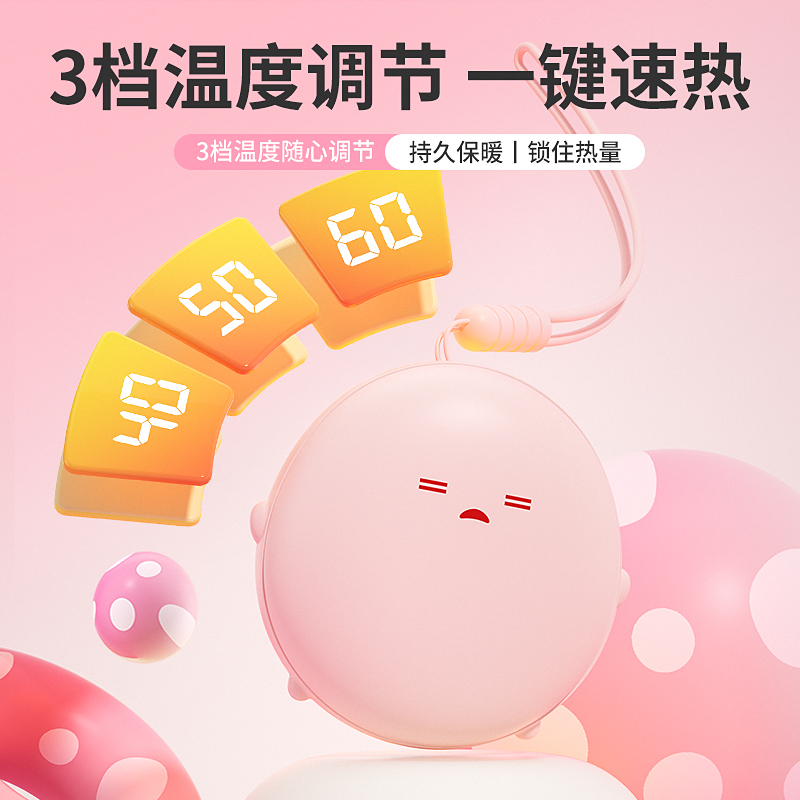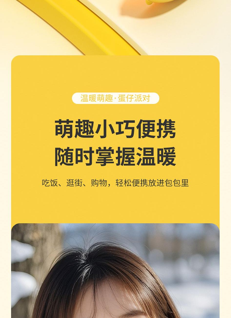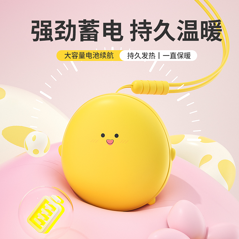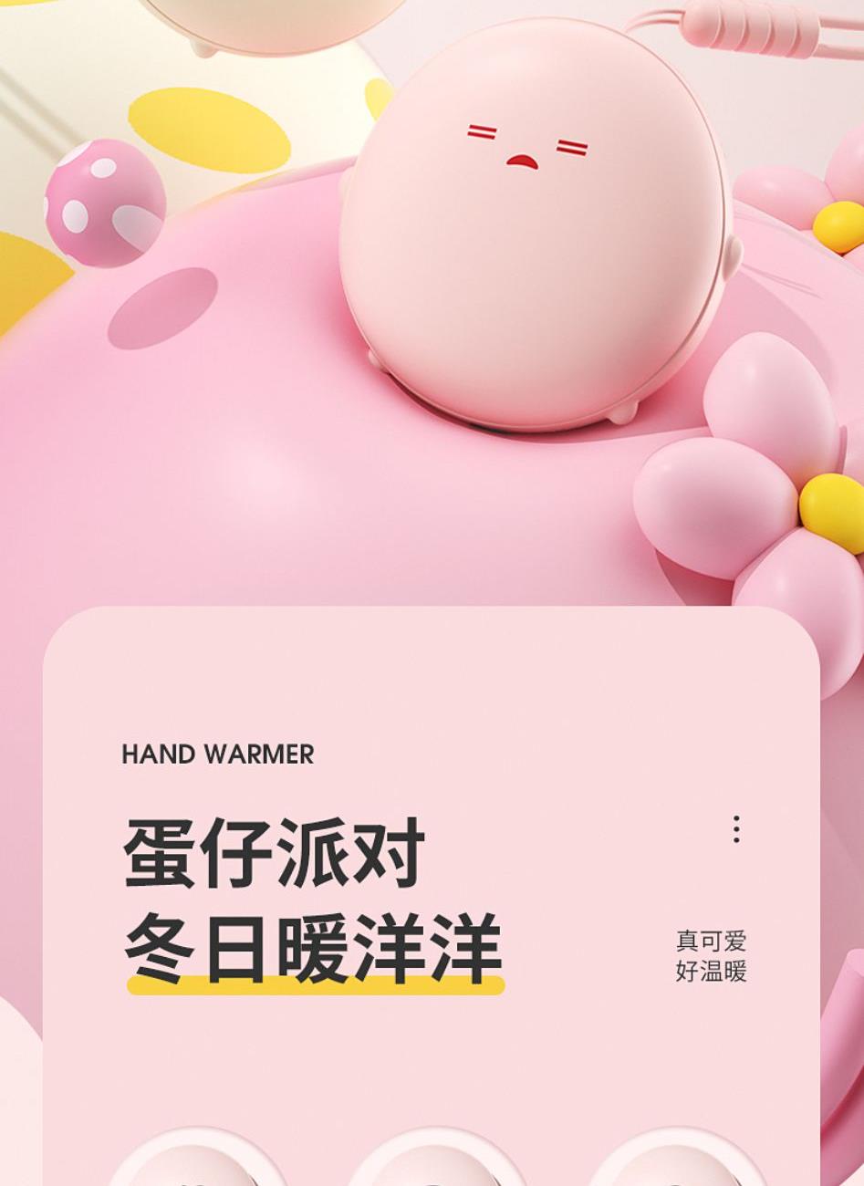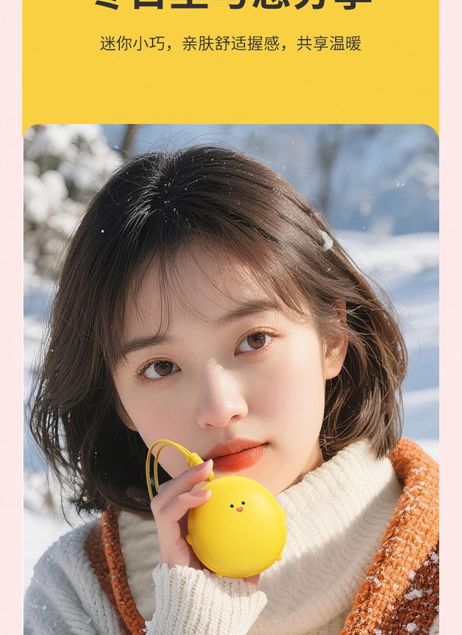 产品材质:ABS+电子元件+硅胶+PVC 产品尺寸: 8.8*8.6*3.75cm 产品颜色:奶白 粉色 黄色 净 重:193g 输入电流:5V/1A 电池容量:3600mAh 功 率:5w 使用时间:1.5-3小时 产品特点: 三档温控 一键速热 迷你小巧 携带方便 双面发热 360°全面温暖 可爱蛋仔造型 圆润舒适手感