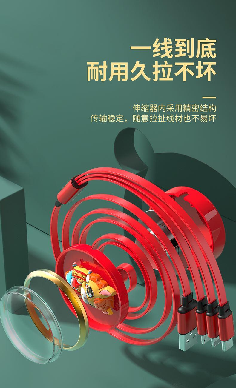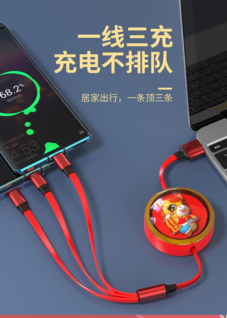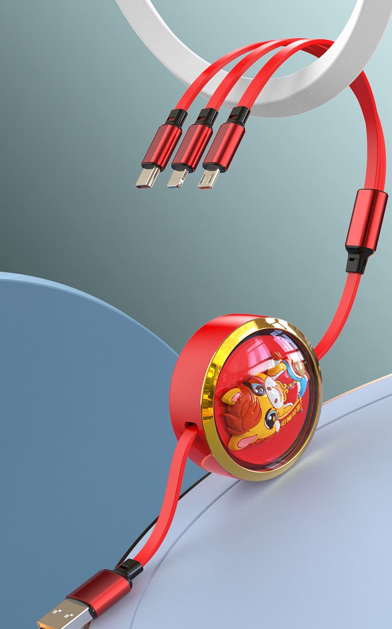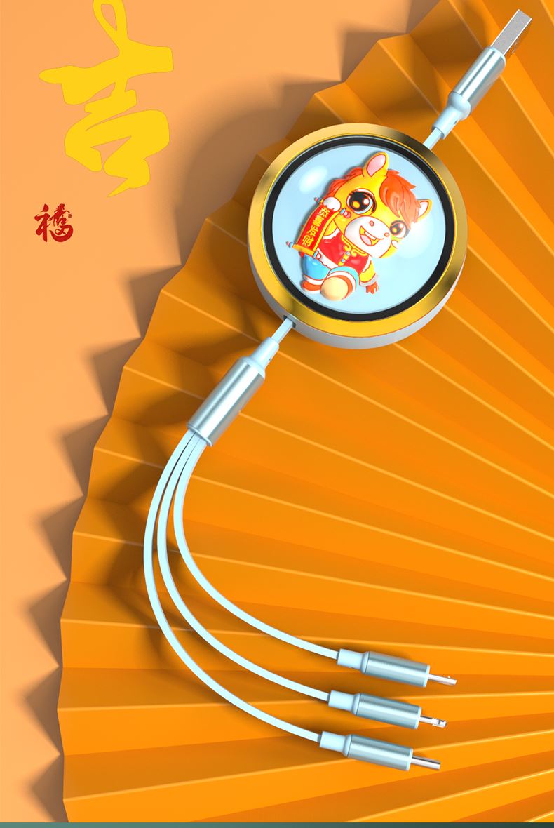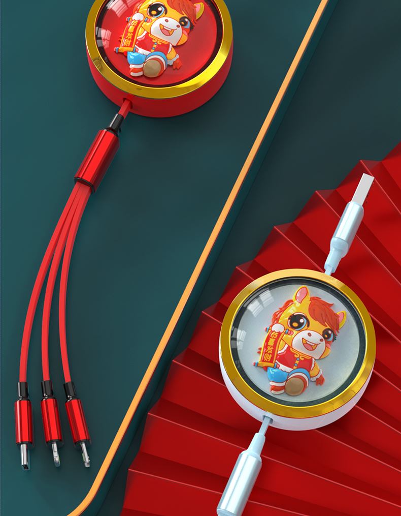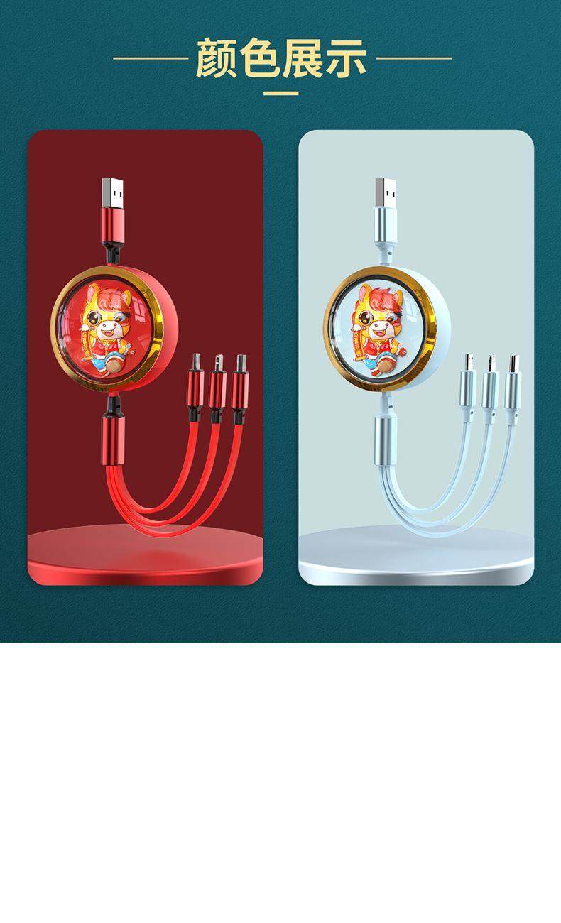 小萌马66W快充一托三伸缩数据线 颜色: 红色 材质:TPE材质 尺寸:1.2M 包装:彩盒包装 【功能特点】: 小萌马生肖公仔造型,66W超级快充 三种接口满足各种手机 1.2米长度设计,使用方便 TPE材质耐用,不易折断 双拉线设计,五档伸缩调节
