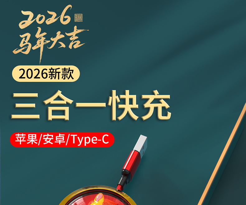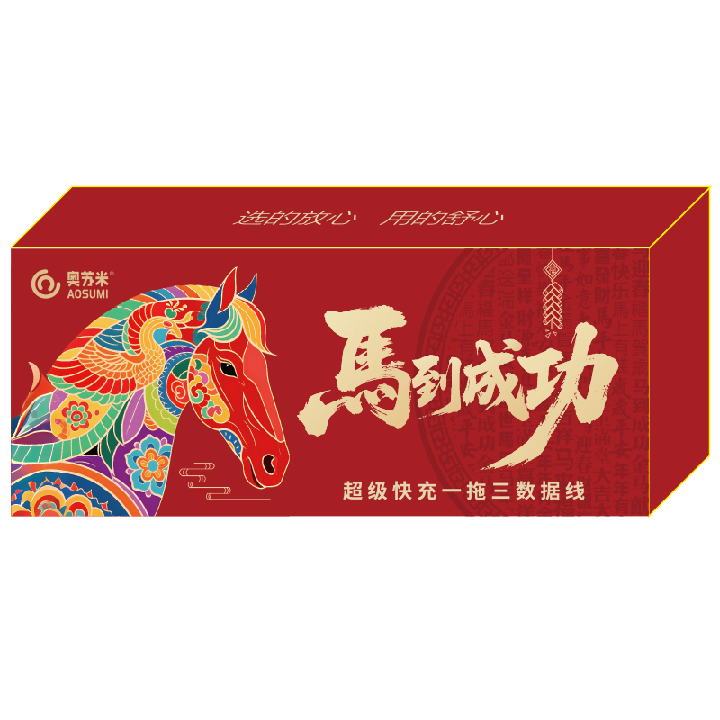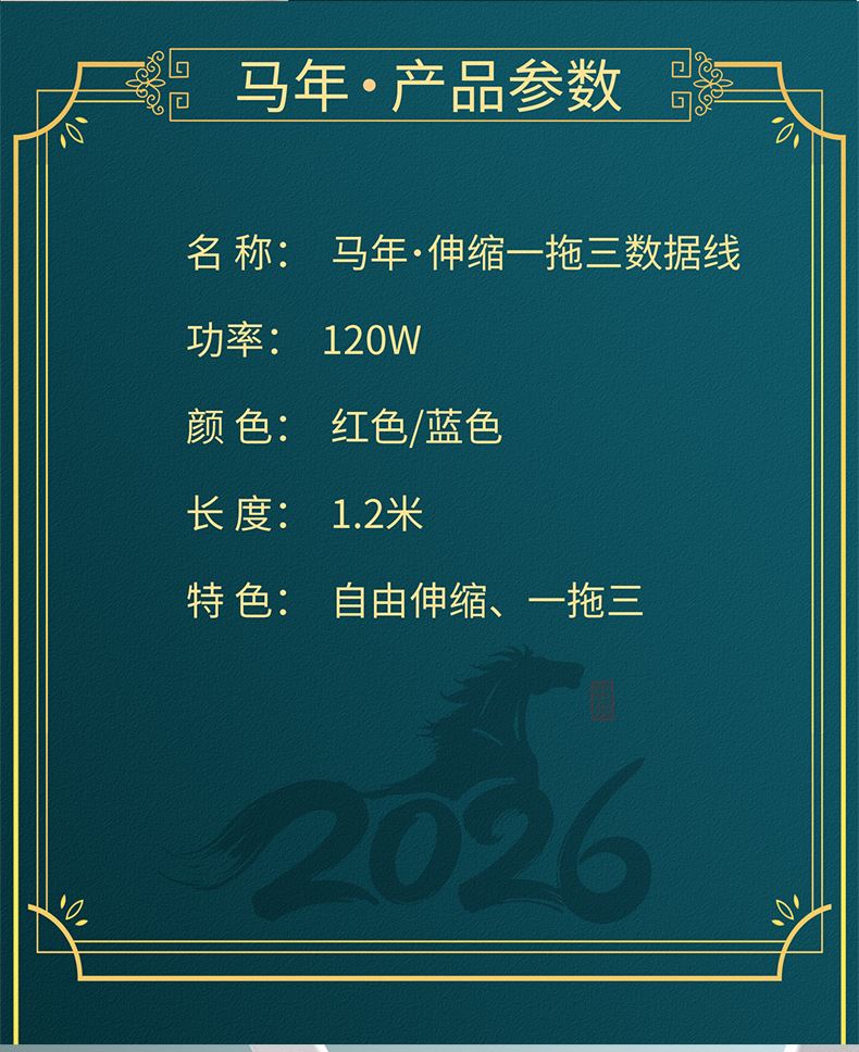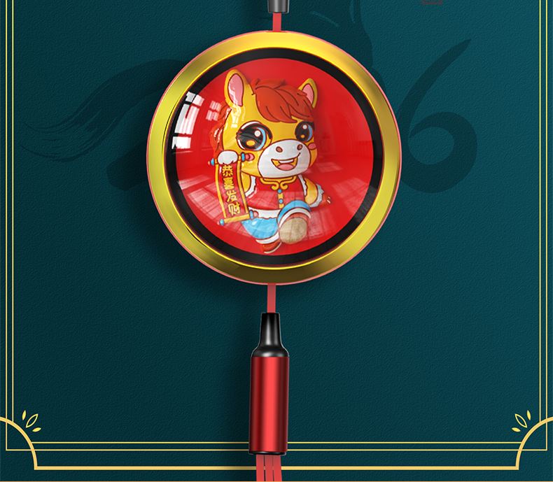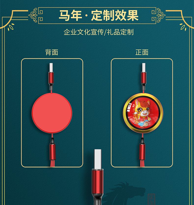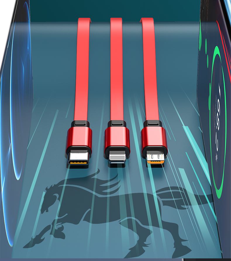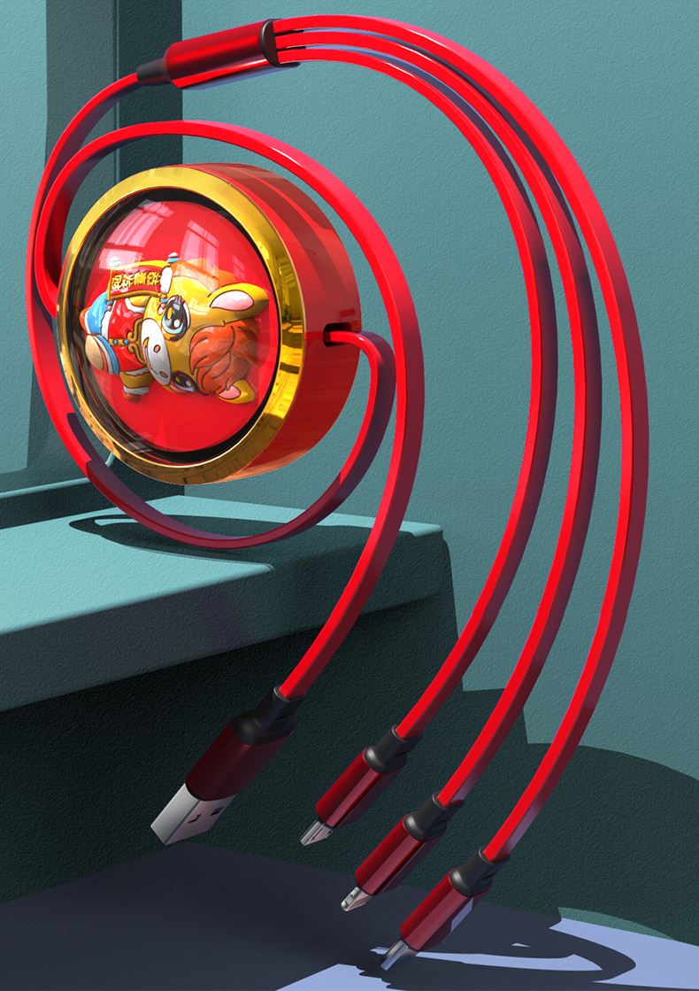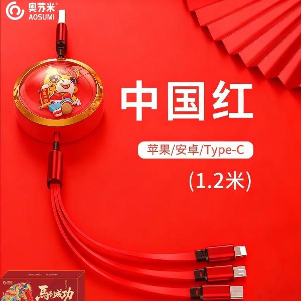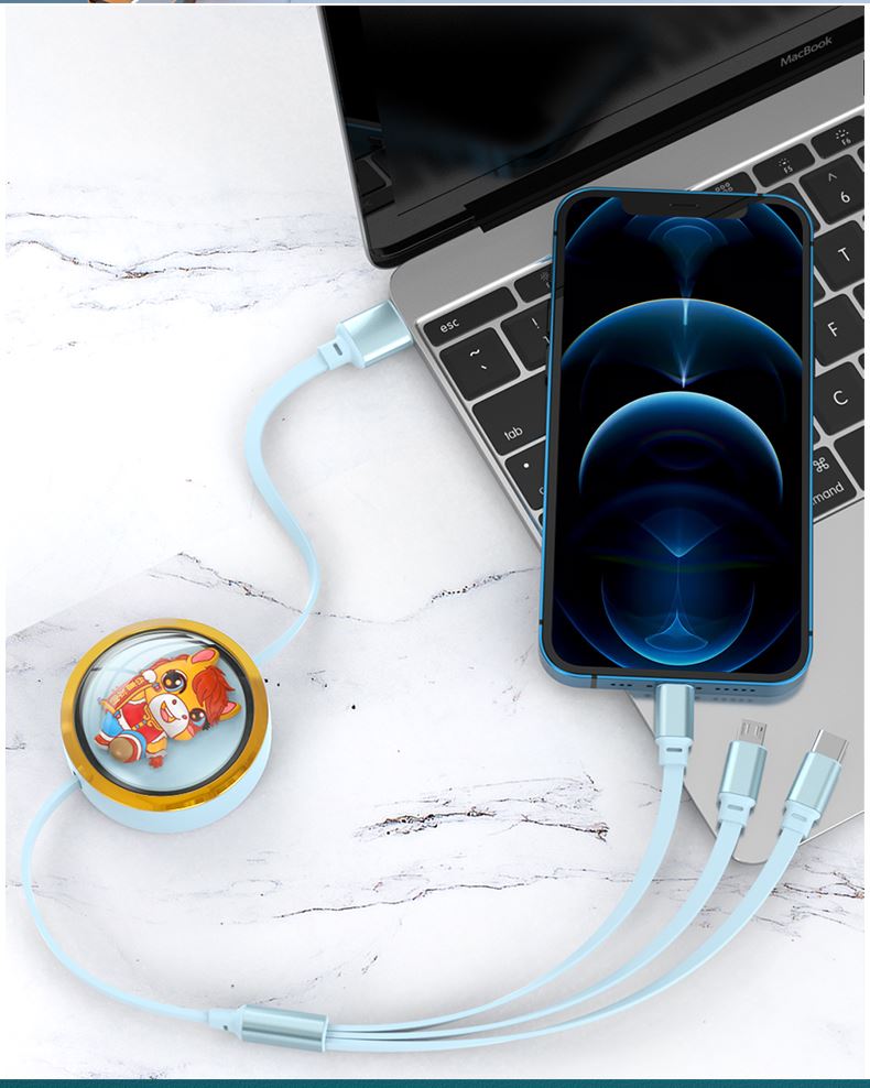 小萌马66W快充一托三伸缩数据线 颜色: 红色 材质:TPE材质 尺寸:1.2M 包装:彩盒包装 【功能特点】: 小萌马生肖公仔造型,66W超级快充 三种接口满足各种手机 1.2米长度设计,使用方便 TPE材质耐用,不易折断 双拉线设计,五档伸缩调节