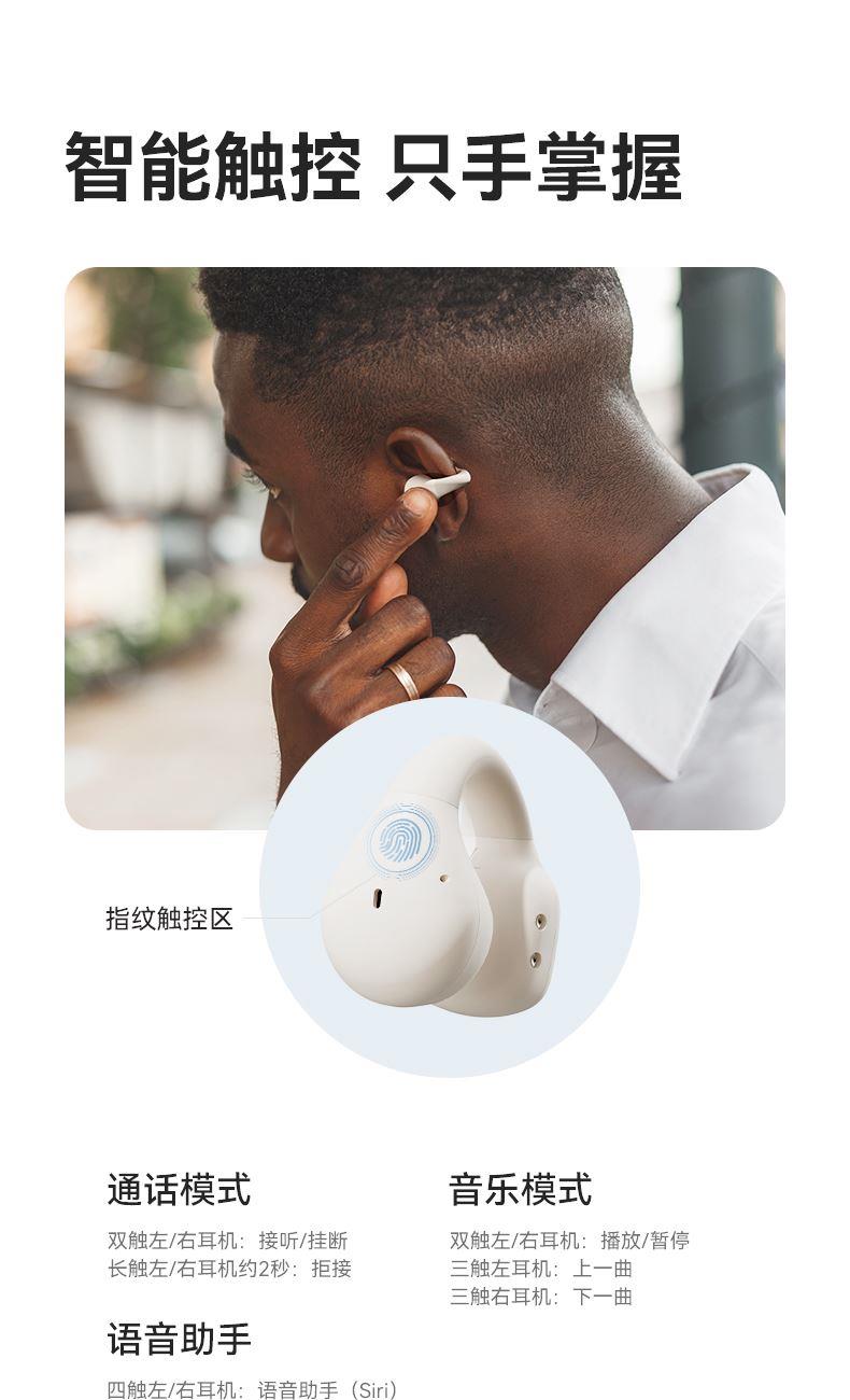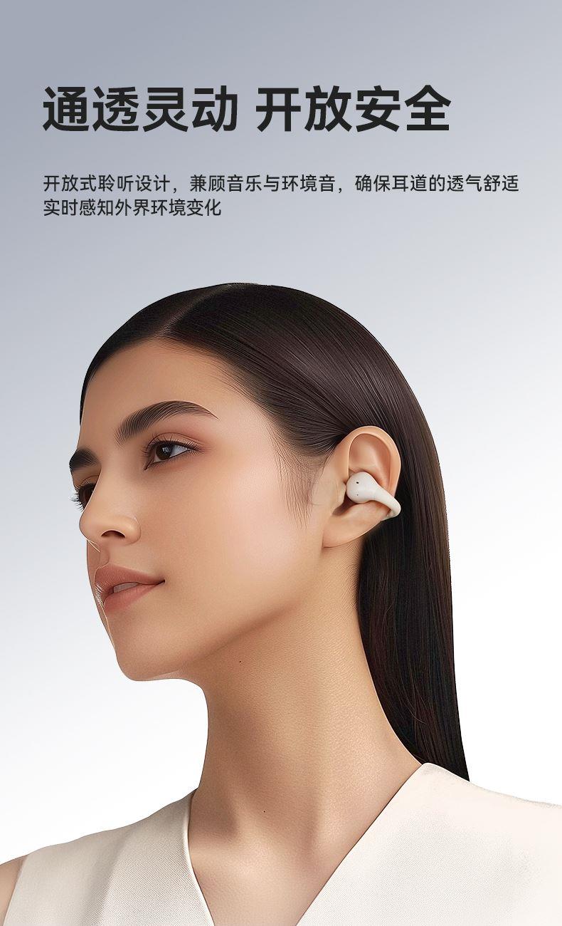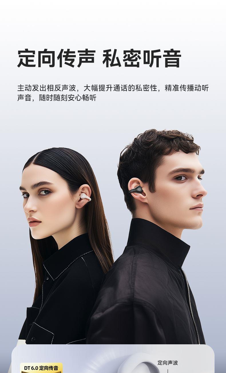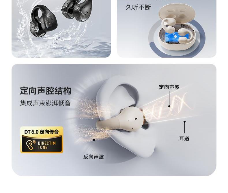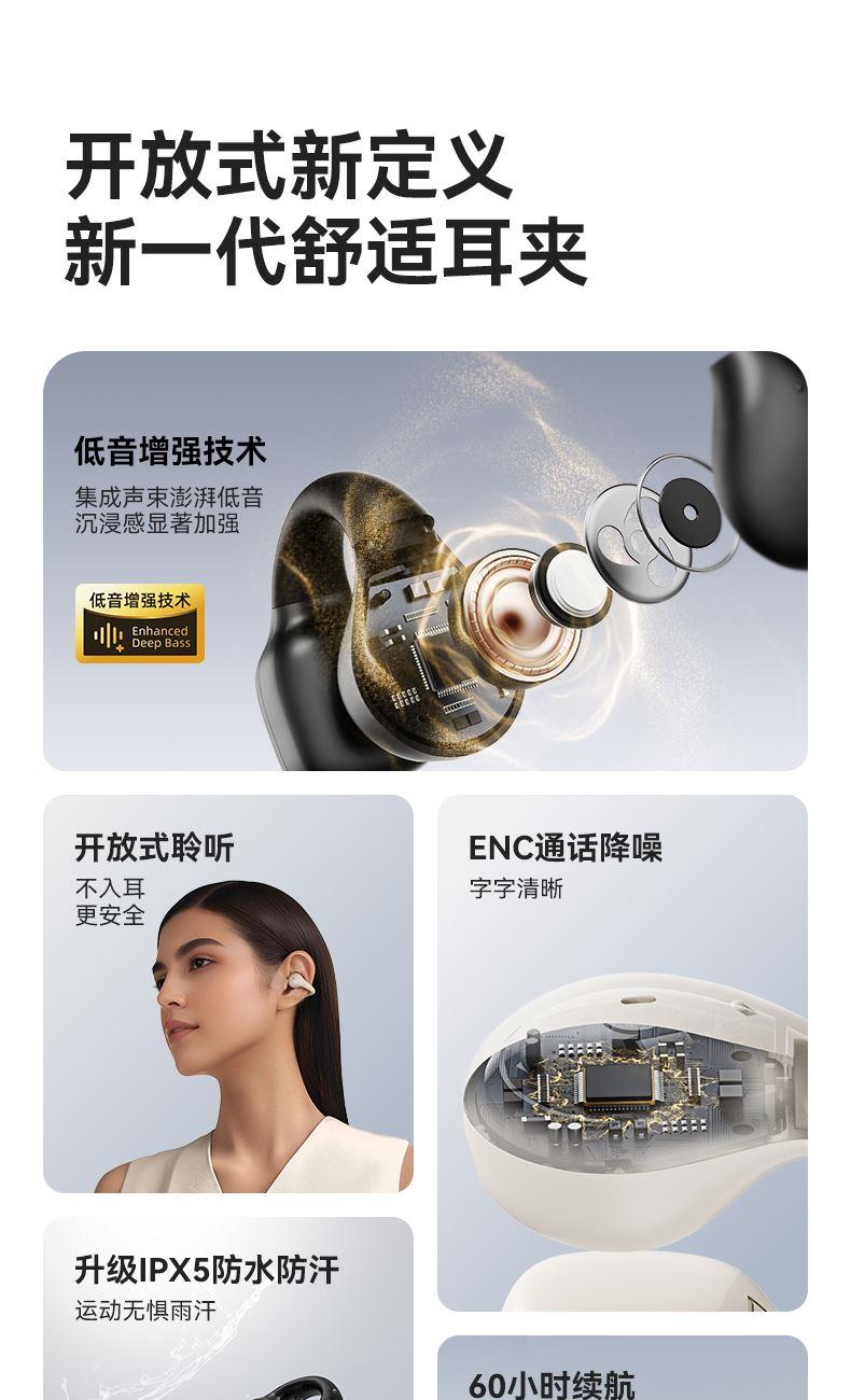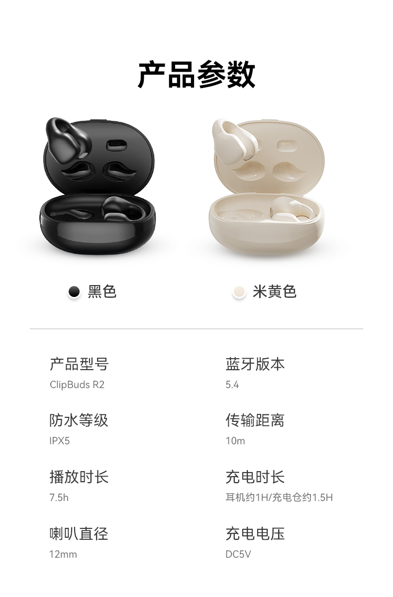 颜色:黑色/米色 电池容量:40mAh*2/400mAh 包装尺寸:88.5*91*39.5mm 外箱尺寸:475*435*210mm 续航时间:30小时 充电时间:1.5小时 蓝牙版本:V5.4 防水级别:IPX5 记忆硅胶耳环,潮搭耳饰,贴合耳廓 开放聆听设计,兼顾环境音,耳朵通透 单耳约 5g,轻盈柔软,久戴不累 夹耳式佩戴,多场景稳固不掉 定向传声,阻漏率 90%,保护听音隐私 单次用 6 小时,总续航 30 小时 ENC 通话降噪,嘈杂环境通话清晰