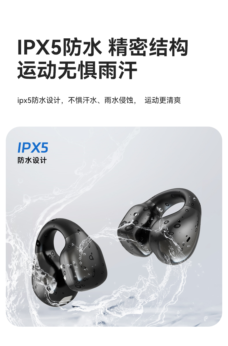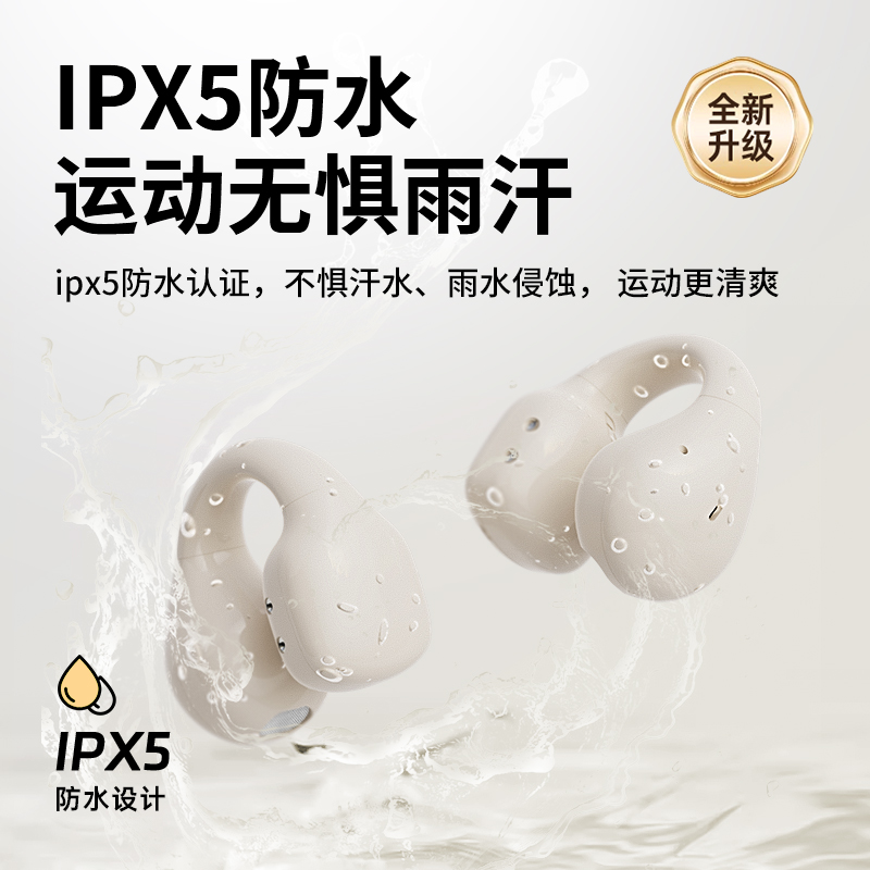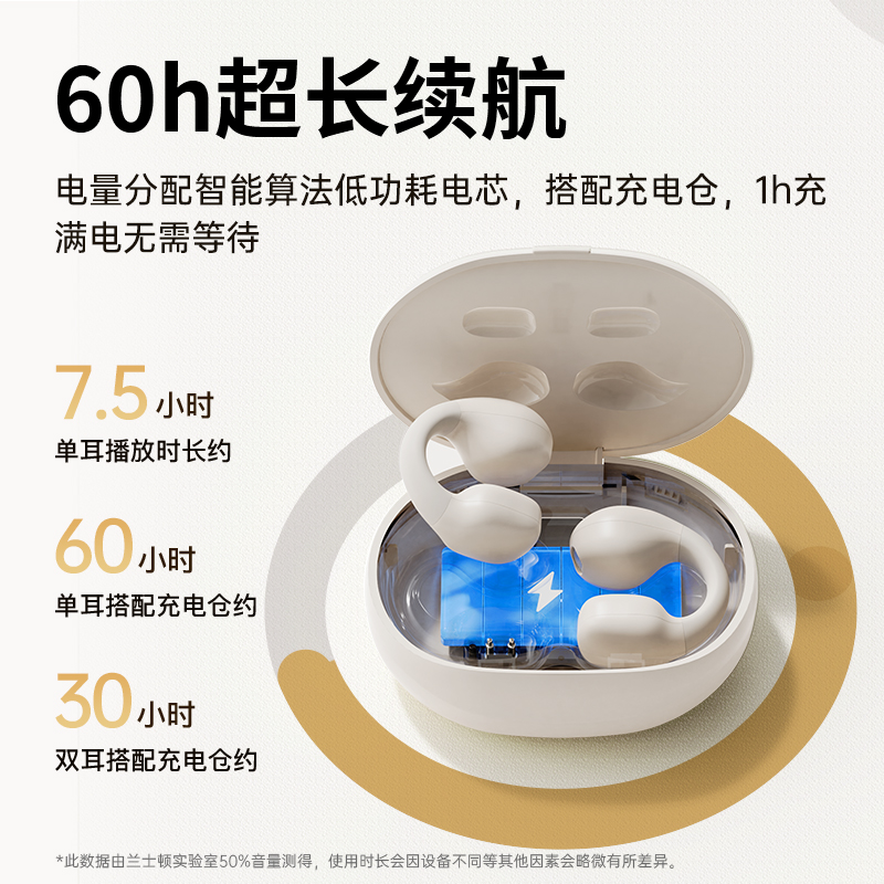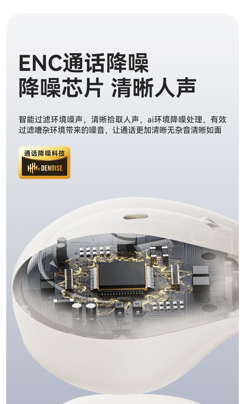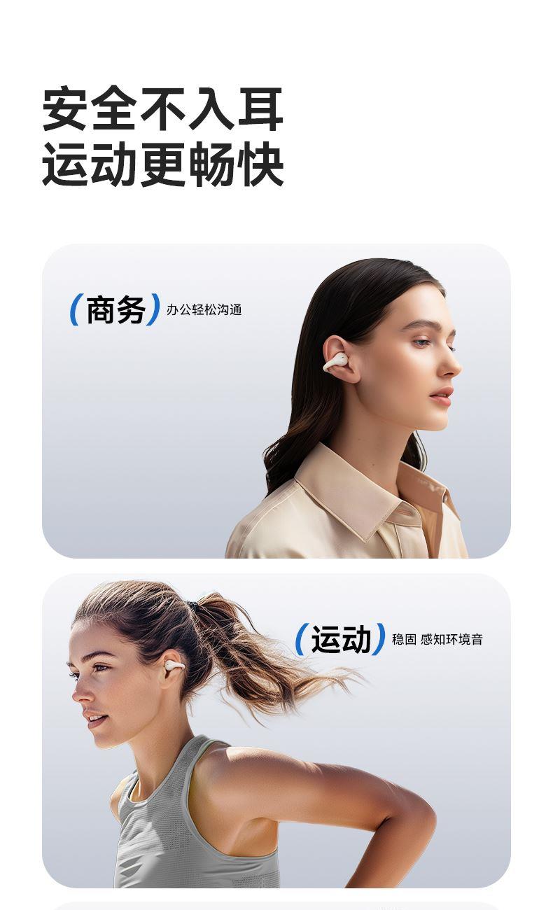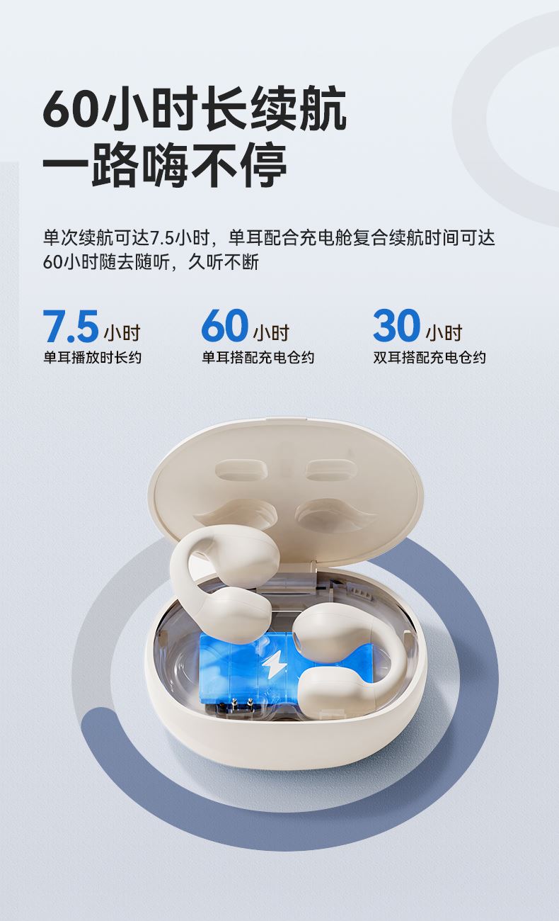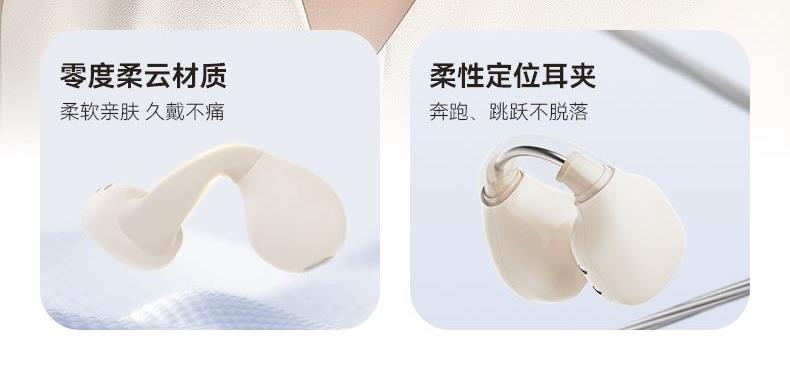 颜色:黑色/米色 电池容量:40mAh*2/400mAh 包装尺寸:88.5*91*39.5mm 外箱尺寸:475*435*210mm 续航时间:30小时 充电时间:1.5小时 蓝牙版本:V5.4 防水级别:IPX5 记忆硅胶耳环,潮搭耳饰,贴合耳廓 开放聆听设计,兼顾环境音,耳朵通透 单耳约 5g,轻盈柔软,久戴不累 夹耳式佩戴,多场景稳固不掉 定向传声,阻漏率 90%,保护听音隐私 单次用 6 小时,总续航 30 小时 ENC 通话降噪,嘈杂环境通话清晰