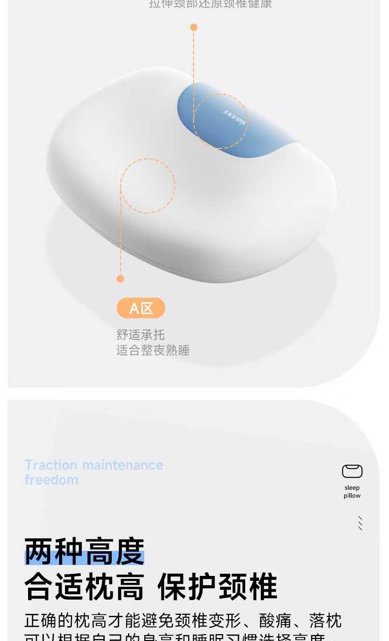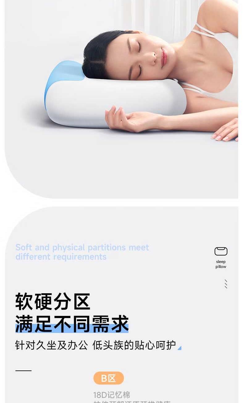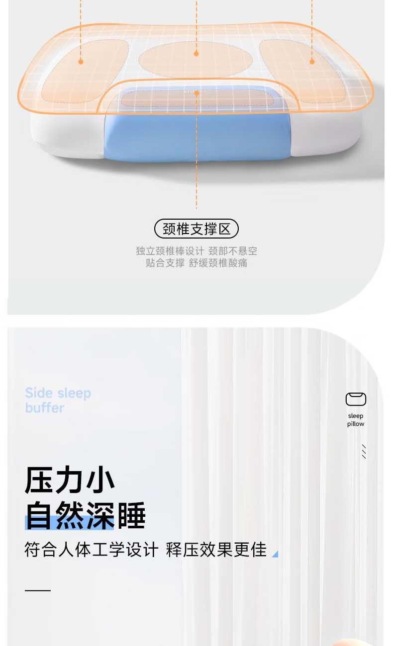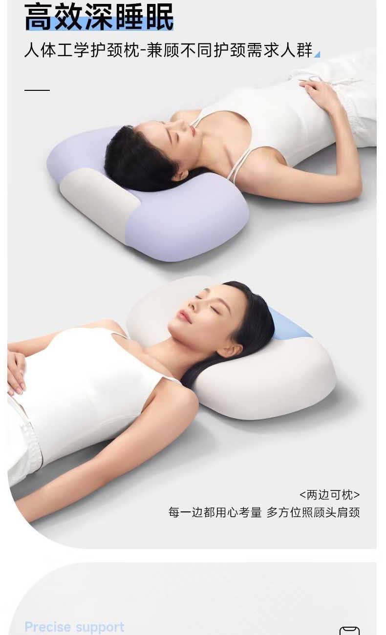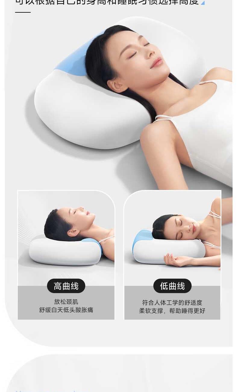 【双向可睡】颈椎专用枕。 【高枕区】高密度12厘米拉伸,还原健康颈椎弧度。 【低枕区】9厘米舒适承托更适合整夜熟睡。