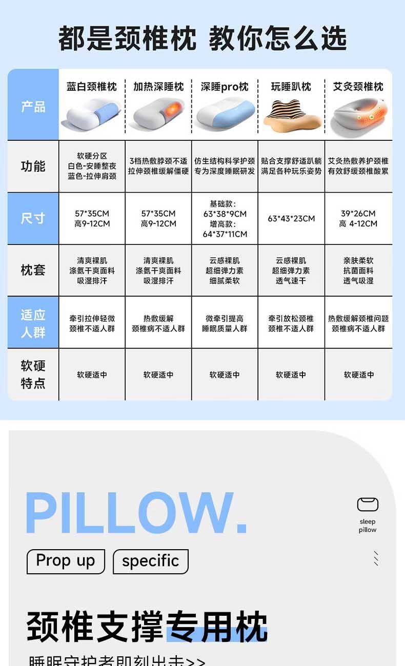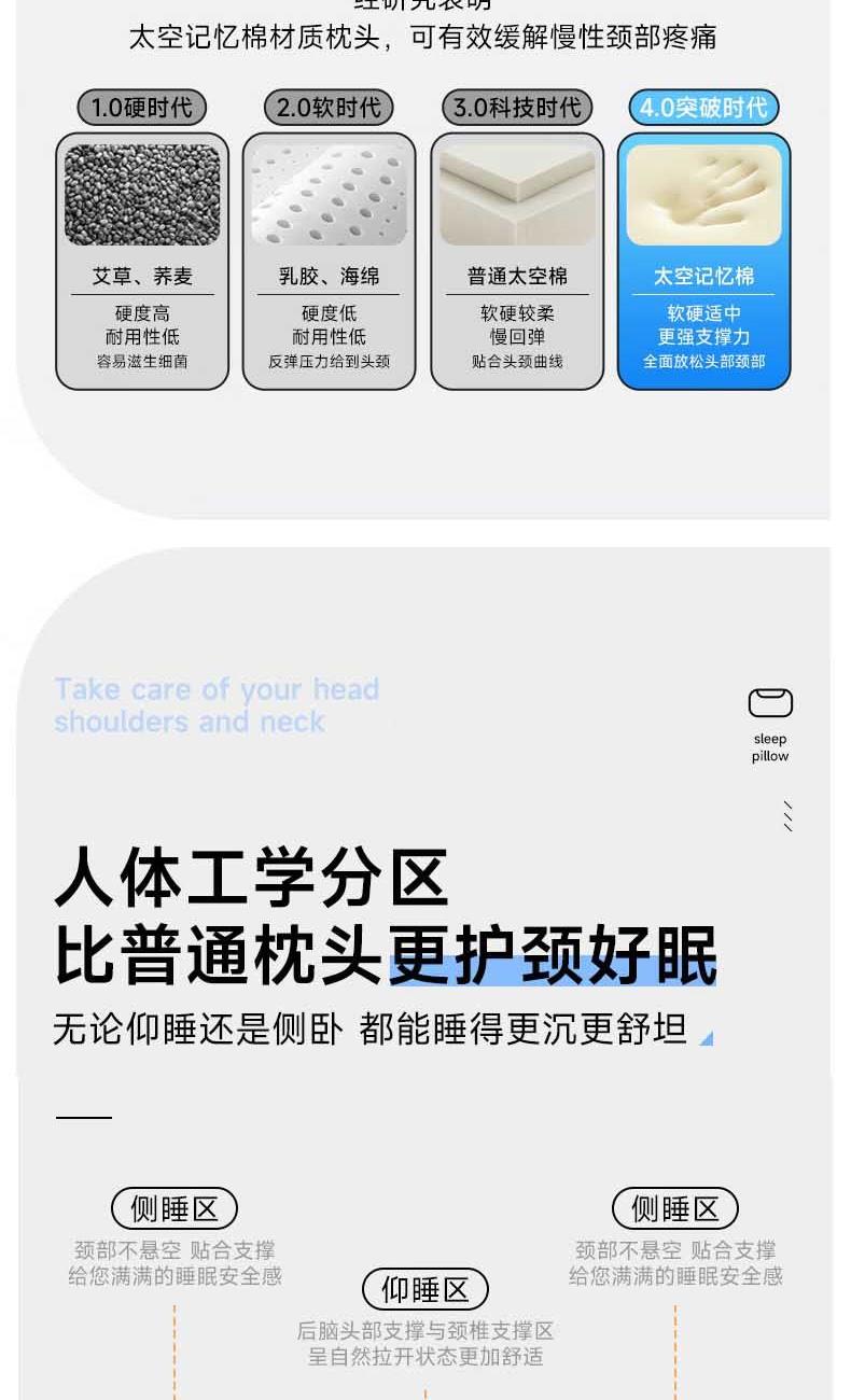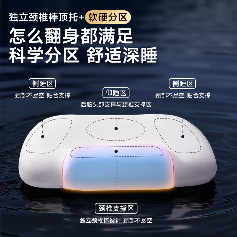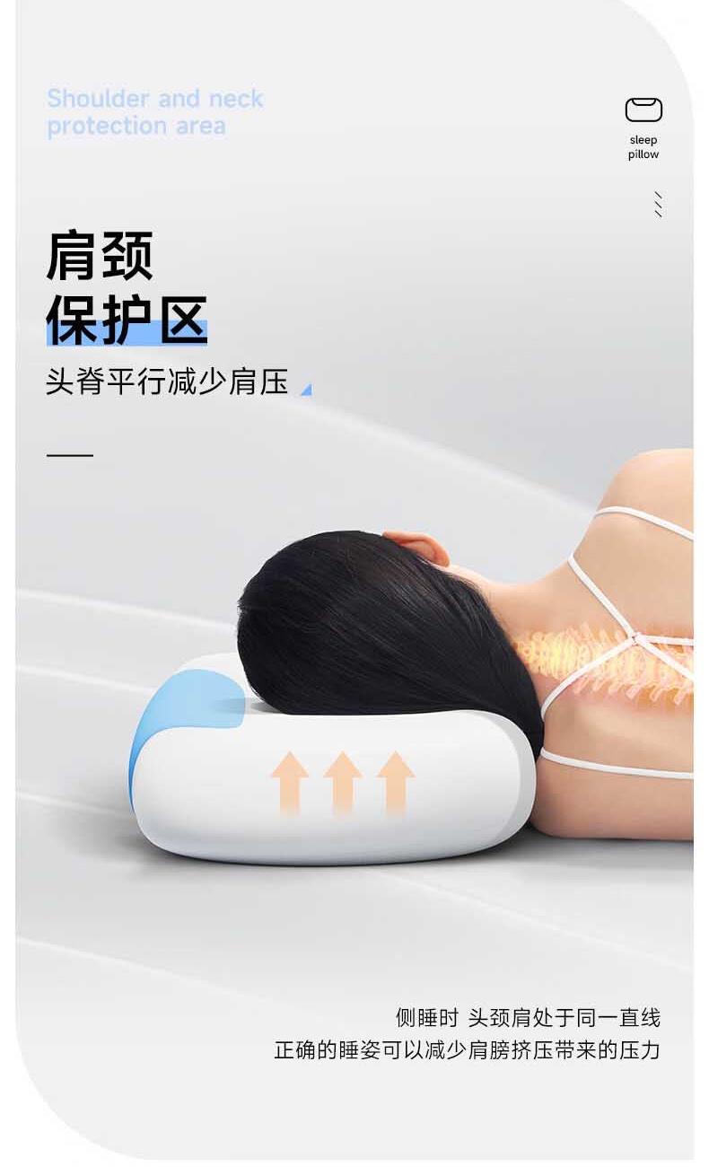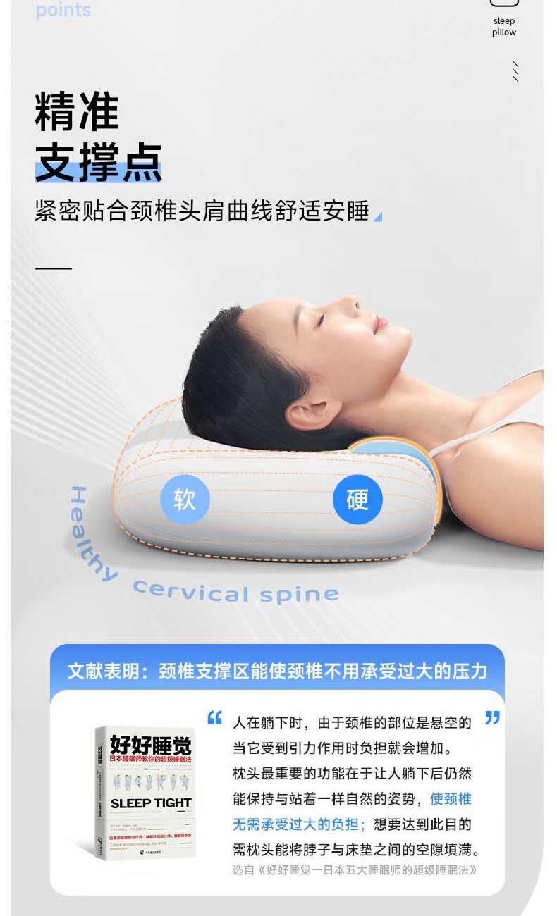 【双向可睡】颈椎专用枕。 【高枕区】高密度12厘米拉伸,还原健康颈椎弧度。 【低枕区】9厘米舒适承托更适合整夜熟睡。